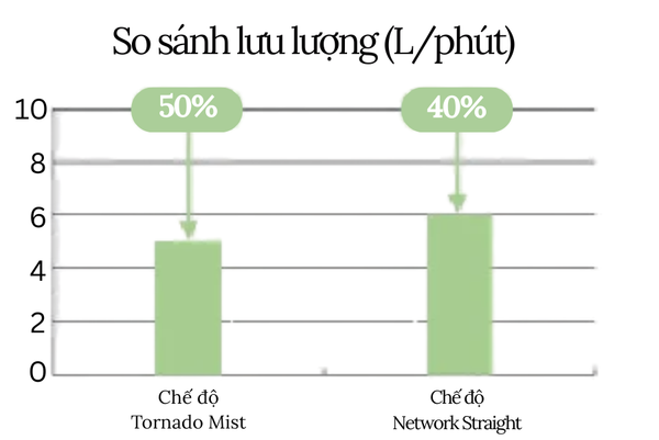 Nhờ cơ chế tạo bọt siêu mịn (Fine Bubble) độc quyền của Science, vòi sen giúp tiết kiệm đáng kể lượng nước sử dụng mà vẫn duy trì hiệu quả làm sạch cao, dù ở cùng một mức áp lực nước. Chế độ phun sương Tornado Mist với góc phun hướng ra ngoài: Tiết kiệm khoảng 50% lượng nước. Chế độ tia nước dạng lưới Network Straight: Tiết kiệm khoảng 40% lượng nước